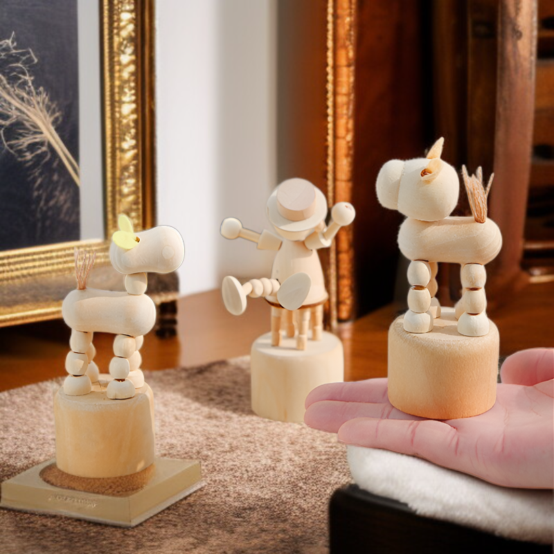 색상: 살구색 둥근 입의 작은 말, 노란색 강아지, 광대 나무 인형, 2인무, 금색 딱정벌레, 큰 귀 강아지, 작은 코끼리, 기린